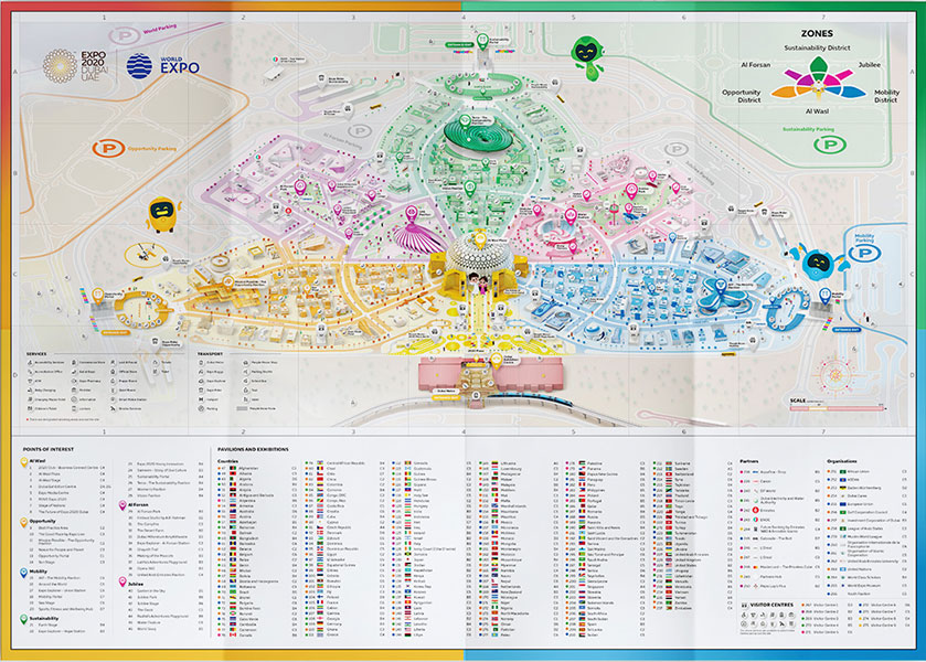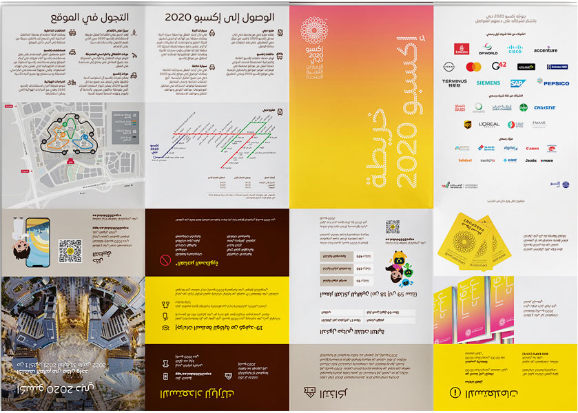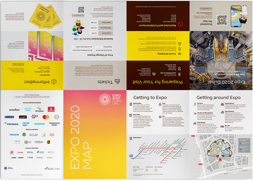 Project breakdown: Medina Content & Design Group managed the full production and content services for the Official Visitor Map, including the printing of 2,000,000 maps in English and Arabic language. Maps were available for visitor to pick-up from information kiosks, and via 30 robot concierges powered by artificial intelligence who traversed the site offering maps to visitors.